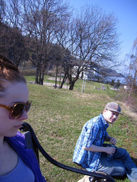 Ja, så vi måtte vente i en time på toget da. Men det var helt greit. Vi gikk bare å chillan på benken. Dere veit, benken.